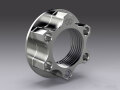 アクスルナットに設置されたピンロックによってスレッドの間隔を意図的に変形させ、ナットの緩みを強力に抑止する画期的なアクスルナット。チタン製。
