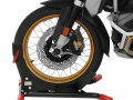 ほんの数秒でバイクを理想的な直立状態で固定するフロントホイールスタンド。使用方法はとっても簡単。スタンドに向かって車体をすすめるだけ。