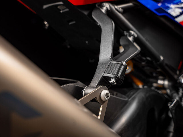 レースに不要のパッセンジャー用フットレスト。このフットペグカバーが取付口をスマートに仕上げるだけでなく、車両運搬時の固定ベルトの荷掛けフックとしても利用でき、大変便利です。