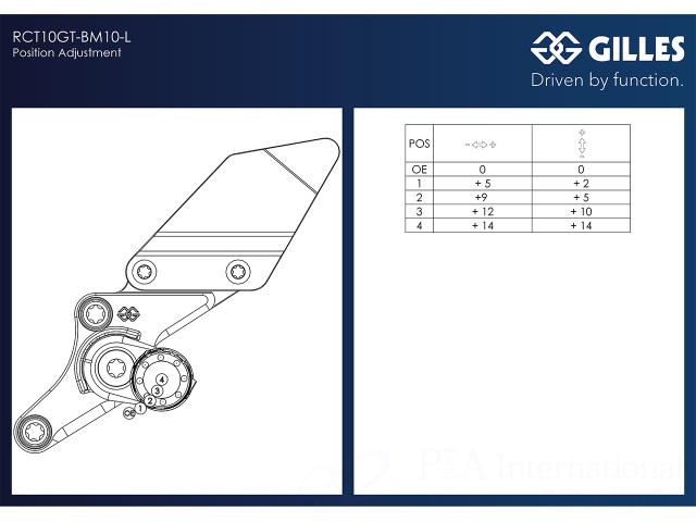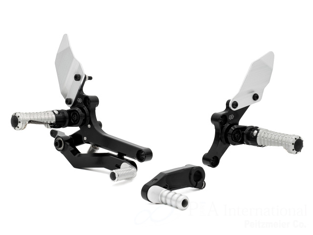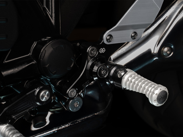 フットペグの位置は回転式のアジャストプレートによって純正位置を含めて5段階で設定が可能。快適でスポーティなライディングが楽しめます。